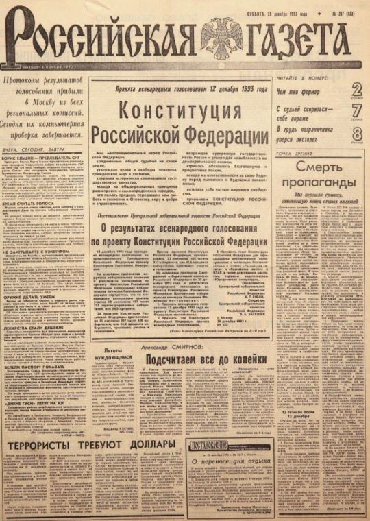 1 ноября 1990 года «Российская газета» была зарегистрирована как официальный печатный орган Верховного Совета РСФСР. Первый номер вышел 11 ноября 1990 года тиражом 200 тысяч экземпляров по цене 10 копеек. Первым нормативным актом, опубликованным в газете, стал Закон РСФСР от 24 октября 1990 года «О действии актов органов Союза ССР на территории РСФСР». В сентябре 1993 года газета была перерегистрирована и стала официальным изданием Правительства Российской Федерации. Официальный статус «Российской газеты» означает, что государственные документы вступают в силу лишь после опубликования на её страницах.